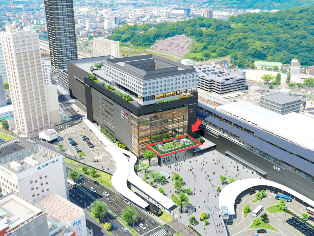 開催場所の「アミュプラザくまもと」3Fにある「おおやねテラス(赤枠)」は、熊本駅間近にありながら、空が広く、心地よい風が感じられる気持ちの良い場所 です。すべり台やブランコなどの遊具もあり、お子様も遊べるので、お買い物の休憩場所としても多く利用されています。