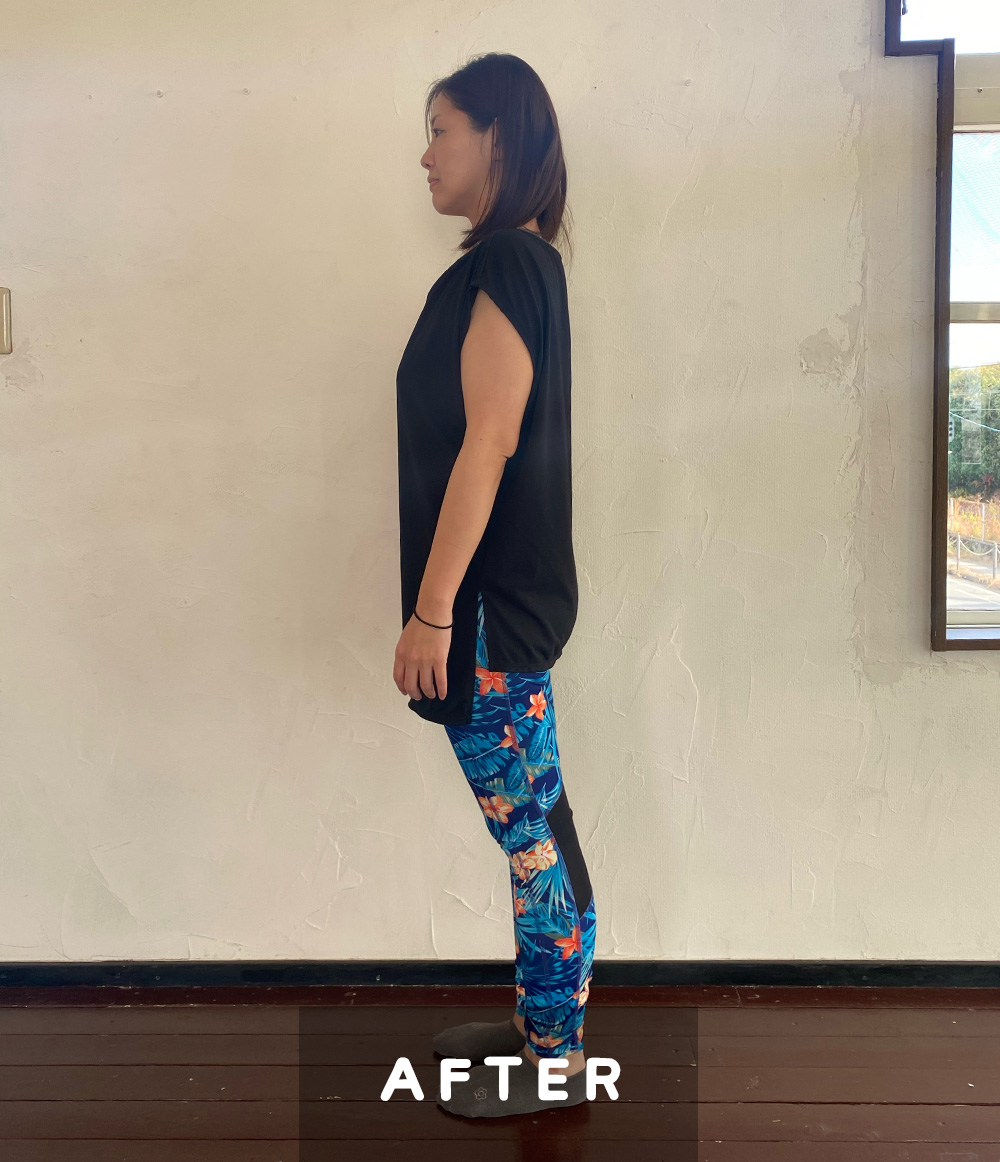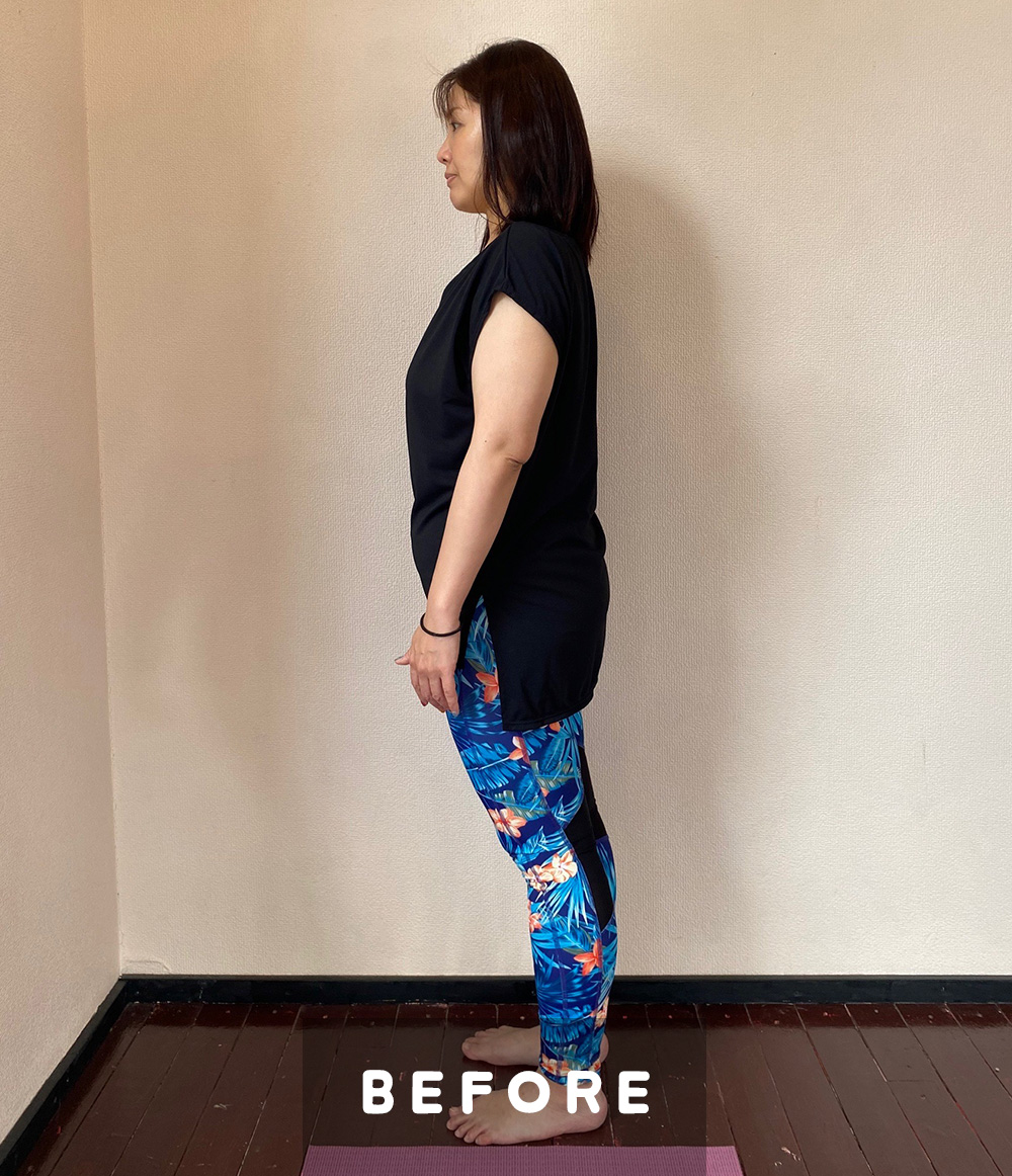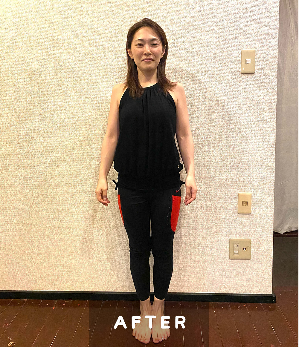 ヨガをして年数経ちましたが、出産出産後から体重が増え続けていました。体も重く感じ、増え続ける体重にストレスを感じていました。仕事も環境も変化したタイミングで、本気で自分を変えたいと思って迷わずモニターとして参加しました。今まで色々なダイエット(1食置き換え、サプリメント、運動等)をやってきましたが、全然効果を感じることはありませんでした。企画の中では、隔週での課題が届くのが楽しみでした。スタートさせてから体重が減り始めるまでそんなに時間はかからず、毎日体重計に乗るのが楽しみで、毎日の課題も就寝前に5分だけ+軽いストレッチを自分で加え、マイペースに心地よく継続させることができました。あっという間の3ヶ月で、終わってしまうと思うと寂しかったです。期間中は7Kg減。その後も継続し、半年過ぎた今は企画をスタートさせてから14Kg減り、体も心も軽くなりました!!