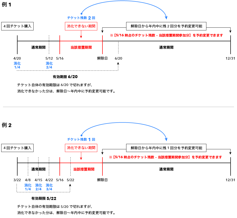 - 5/18更新:まん延防止等重点措置が解除された時点で、上記1,2,3の対応内容は終了し、振替可能分やチケット残数振替可能分の算出基準の期間は5/16〜解除日までと致します。