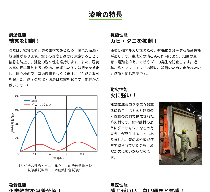 採用しておりますが、漆喰は調湿効果があり、室内空間を適度な湿度に保つことで、ウィルスの侵入を未然に防いてくれると言われております。