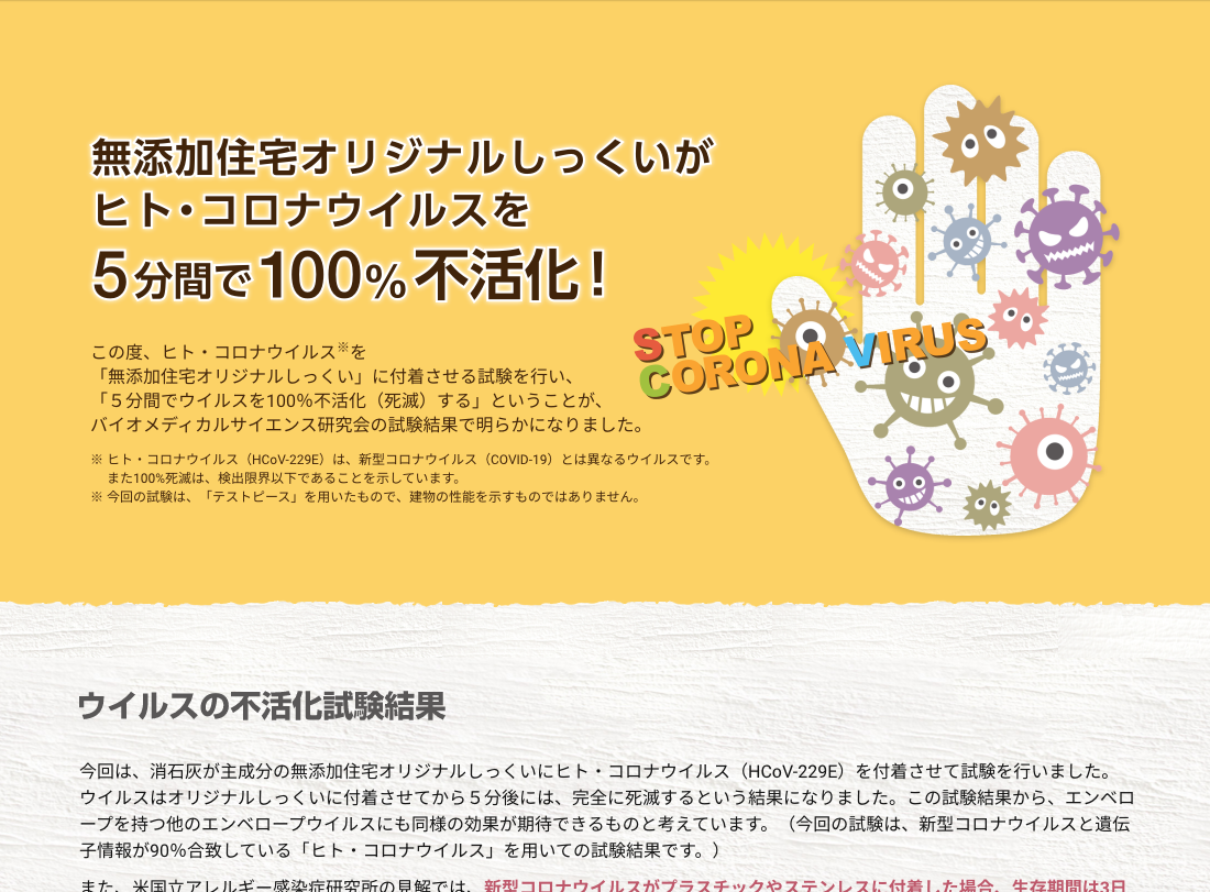 また、使用している漆喰は「無添加住宅オリジナルしっくい」を使用しており、この漆喰は、湿度を保つだけではなく、科学物質を吸着、分解。また、新型コロナウィルスの遺伝子情報が90%合致している「ヒト・コロナウィルス」を用いた実験で、5分間で100%不活性化(死滅)するという結果が出ています。
